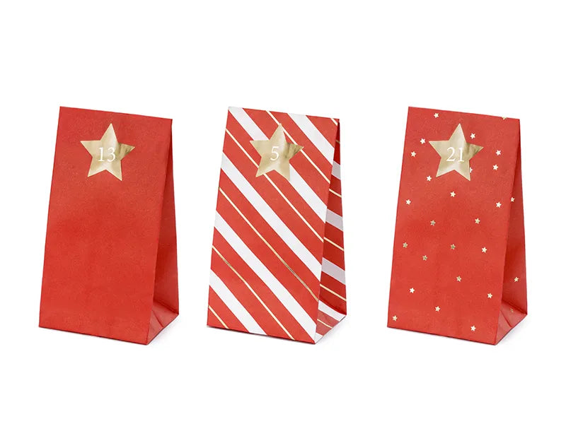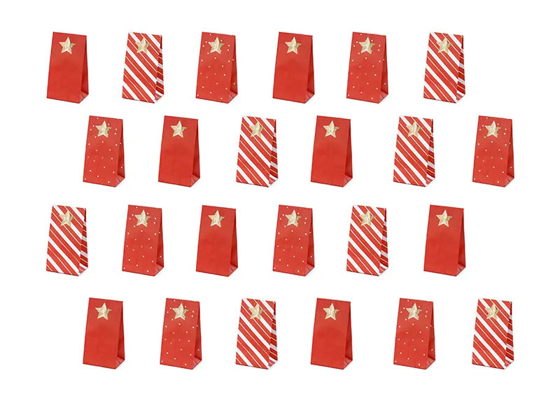 Aðventudagatal - Bréfpokar og límmiðar - 24 stk - Rautt og gyllt