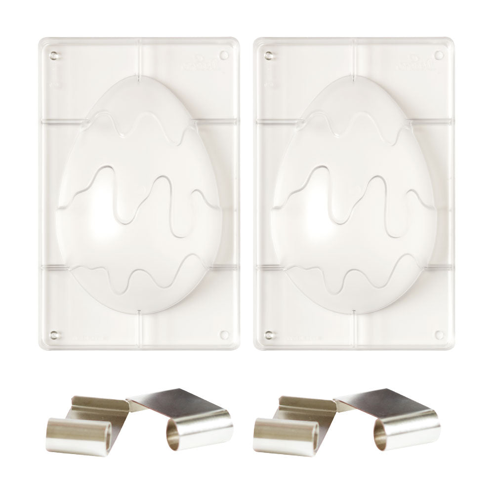 Kit consisting of 2 polycarbonate egg molds and 4 chromed springs, perfect for making chocolate eggs in a single step. Practical step-by-step brochure contained inside. If you want to get colored eggs, brush the mold with fat-soluble dye or add it to melted chocolate. You can also paint floral motifs or abstract decorations. Have fun customizing the eggs with croissant decorations in royal icing or using ready-to-use sugar decorations.