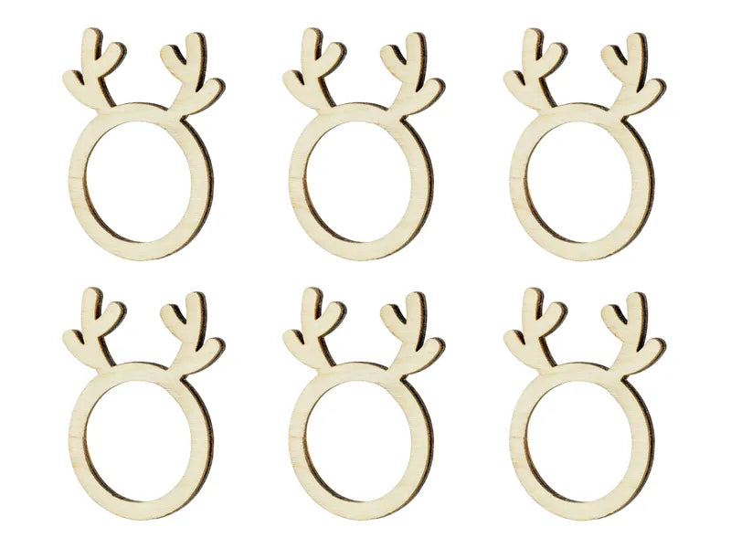 Wooden rings for napkins in shape of reindeers, size approx. 6 x 7.5 cm, diameter of hole for napkins approx. 4 cm.