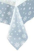 Glær (gegnsær) plastdúkur með áprentuðum hvítum snjókornum 135 x 275 cm. frá Unique Party. Frábær yfirdúkur yfir einlitan dúk.