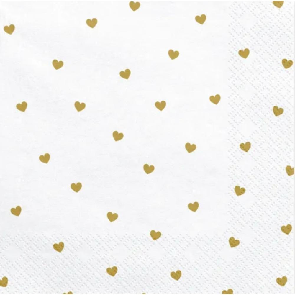 Servíettur - Hjörtu - 33 x 33 cm - Hvítar og gylltar