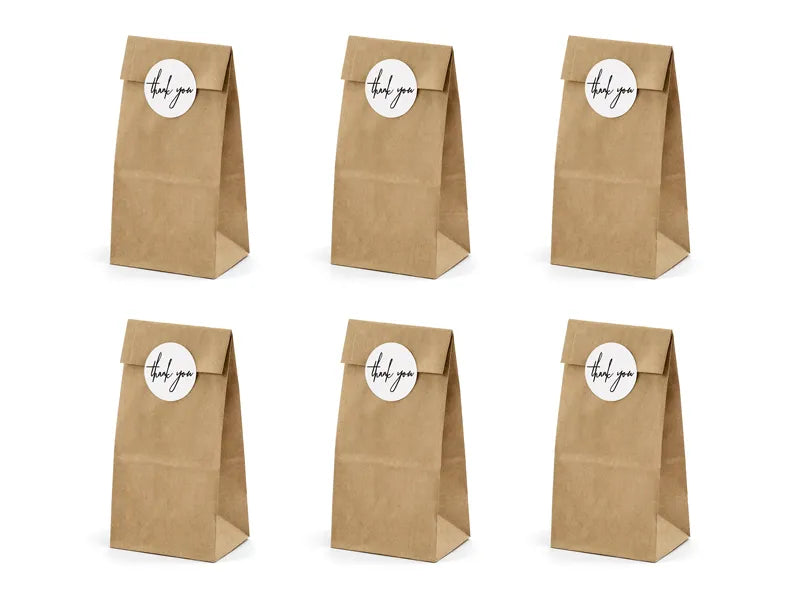 Treat bags, made of kraft paper, with 6 white stickers Thank you, sizes after assembling approx. 8x18x6 cm.