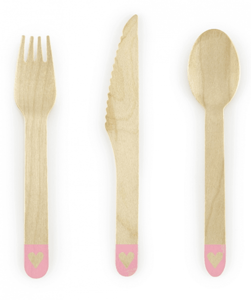 Hnífapör úr viði - Hjörtu - Bleik - 18 stk