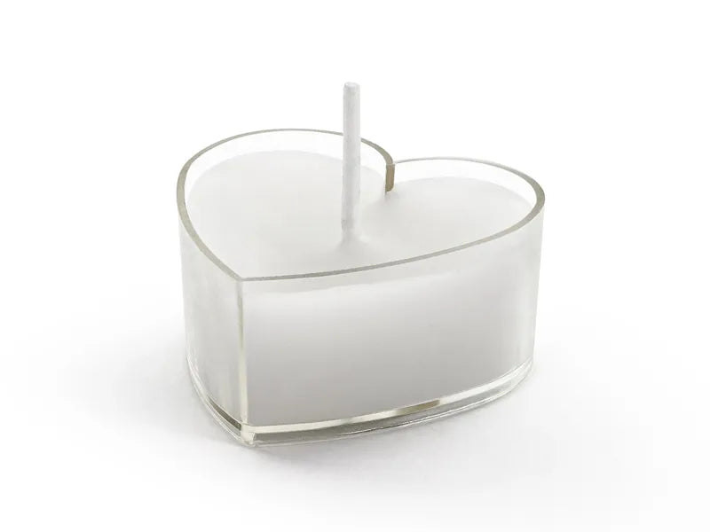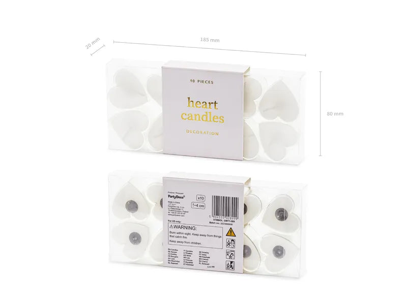 Tealight candles in shape of heart, size approx. 4 cm. The set includes 10 candles. Burning time: 2 hours.