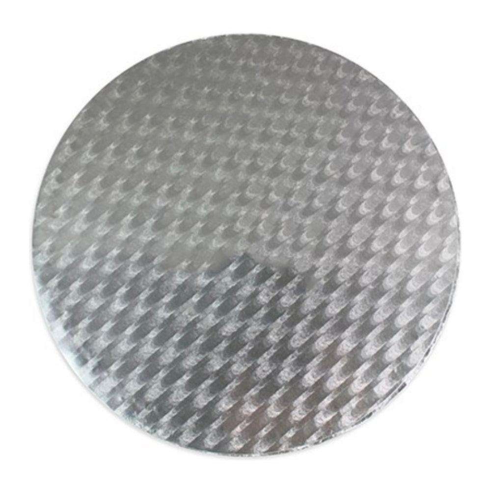 Þykkt kringlótt silfurlitað kökuspjald frá PME. Spjaldið er stíft og það blotnar ekki undan kökunni.