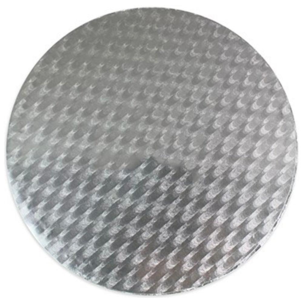 Þykkt kringlótt silfurlitað kökuspjald frá PME. Spjaldið er stíft og það blotnar ekki undan kökunni.