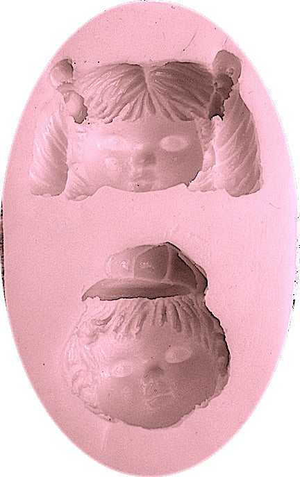 Creates a young girl's face with pony tails that is 1½ inches wide by ¾ inch high and ½ inch deep. The boy's face is 1 inch wide by 1¼ inches high and ½ inch deep, including the baseball cap. Sunflower Sugar Art silicone molds are handcrafted in the USA from FDA-approved food grade silicone that is durable, flexible and heat resistant (up to 500° F). They are stain and odor resistant, oven safe and dishwasher safe. Great for making fondant, gumpaste, chocolate, isomalt, soap, candle wax and more!