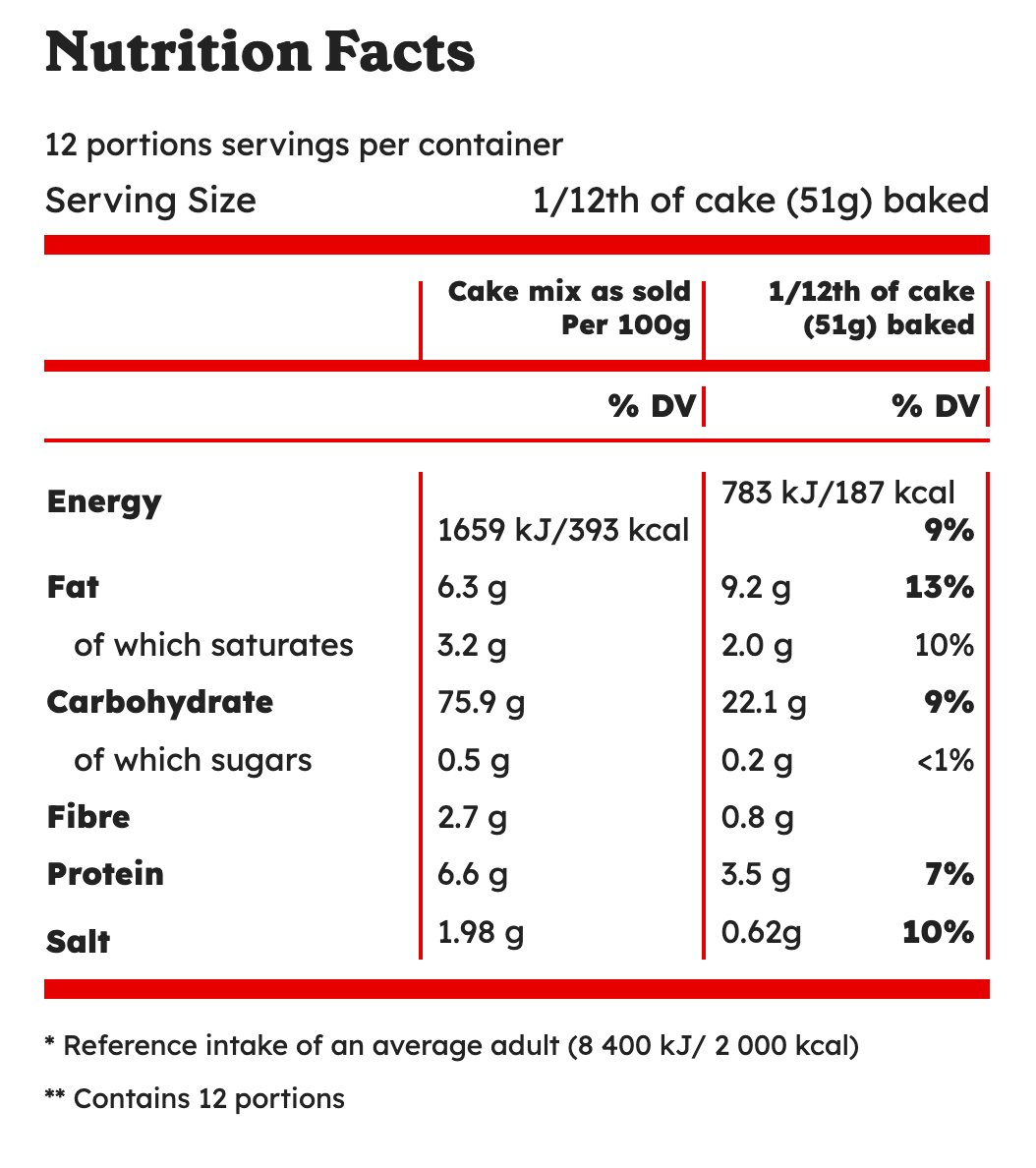 Ingredients: Sweetener (Maltitol), Wheat Flour, Fat-Reduced Cocoa Powder (5%), Palm Fat, Raising Agents (Calcium Phosphates, Sodium Carbonates), Corn Starch, Emulsifiers (Mono- and Diglycerides of Fatty Acids, Sodium Stearoyl-2-Lactylate), Salt, Stabilisers (Sodium Carboxymethylcellulose, Xanthan Gum), Flavourings.