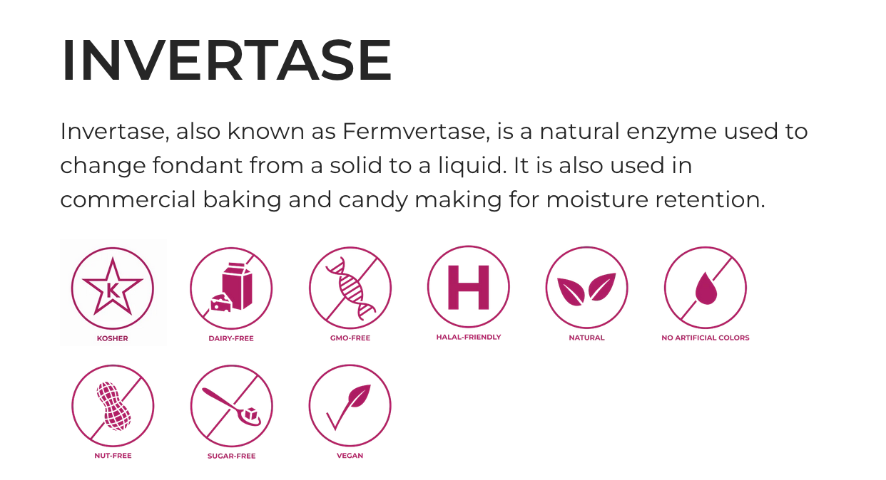 Invertase, also known as Fermvertase, is a natural enzyme used to change fondant from a solid to a liquid. It is also used in commercial baking and candy making for moisture retention. Adding invertase to candy recipes, such as fondant candy fillings, will result in liquifying the fondant over time. Invertase is used in candies like cherry cordials and cream eggs to make the creamy liquid center. It can also be used to prevent crystallization in ganache centers.