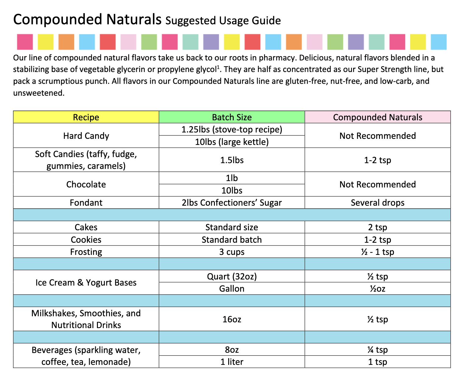 Það þarf að nota um helmingi meira af þessum bragðefnum en sterku bragðefnunum frá LorAnn Oils. Nátturulegu bragðefnin eru hins vegar helmingi sterkari en extract bragðefni og því skal nota minna af þessum bragefnum í uppskriftir sem gefa upp extract.