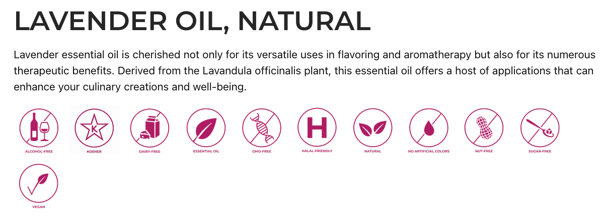 Lavender Oil (Lavandula officinalis) is a pure, natural essential oil and can be used as a flavoring as well as in aromatherapy. When used as a flavoring, use sparingly. Essential oils are potent.
