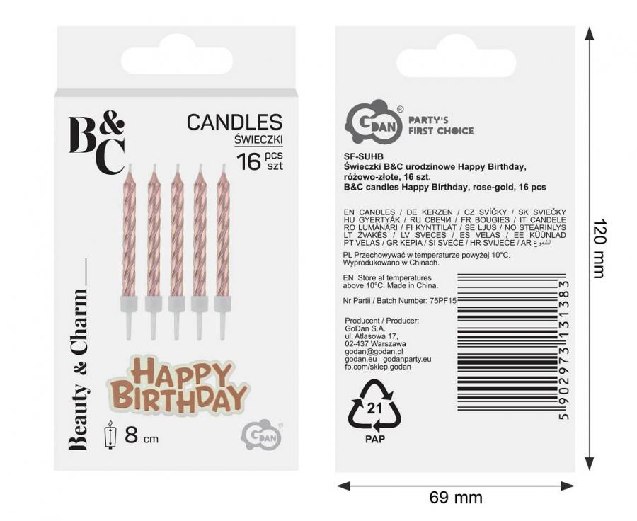 Afmæliskerti - Með stjökum 16 sett og HB Skilti - 8cm - Snúin Rosegold