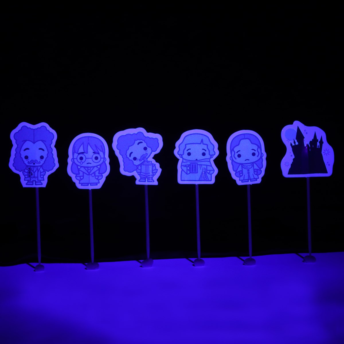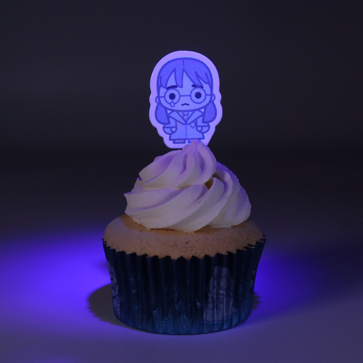 - Includes 24 double-sided paper toppers on wooden sticks and 24 matching cupcake cases with glow in the dark features. Toppers include 6 different designs: Moaning Myrtle, Bloody Baron, Nearly Headless Nick, Helena Ravenclaw, Fat Friar and a silhouette of Hogwarts
