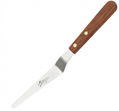 12 cm spatúla með sveigðu blaði. Það er rosalega gott að nota stórt og langt blað til þess að slétta smjörkrem ofan á kökum.