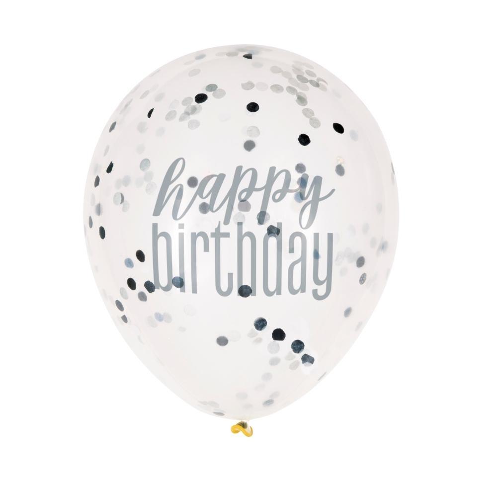Blöðrur - Gegnsæjar með confetti skrauti - Happy Birthday - Svartar - 6 stk