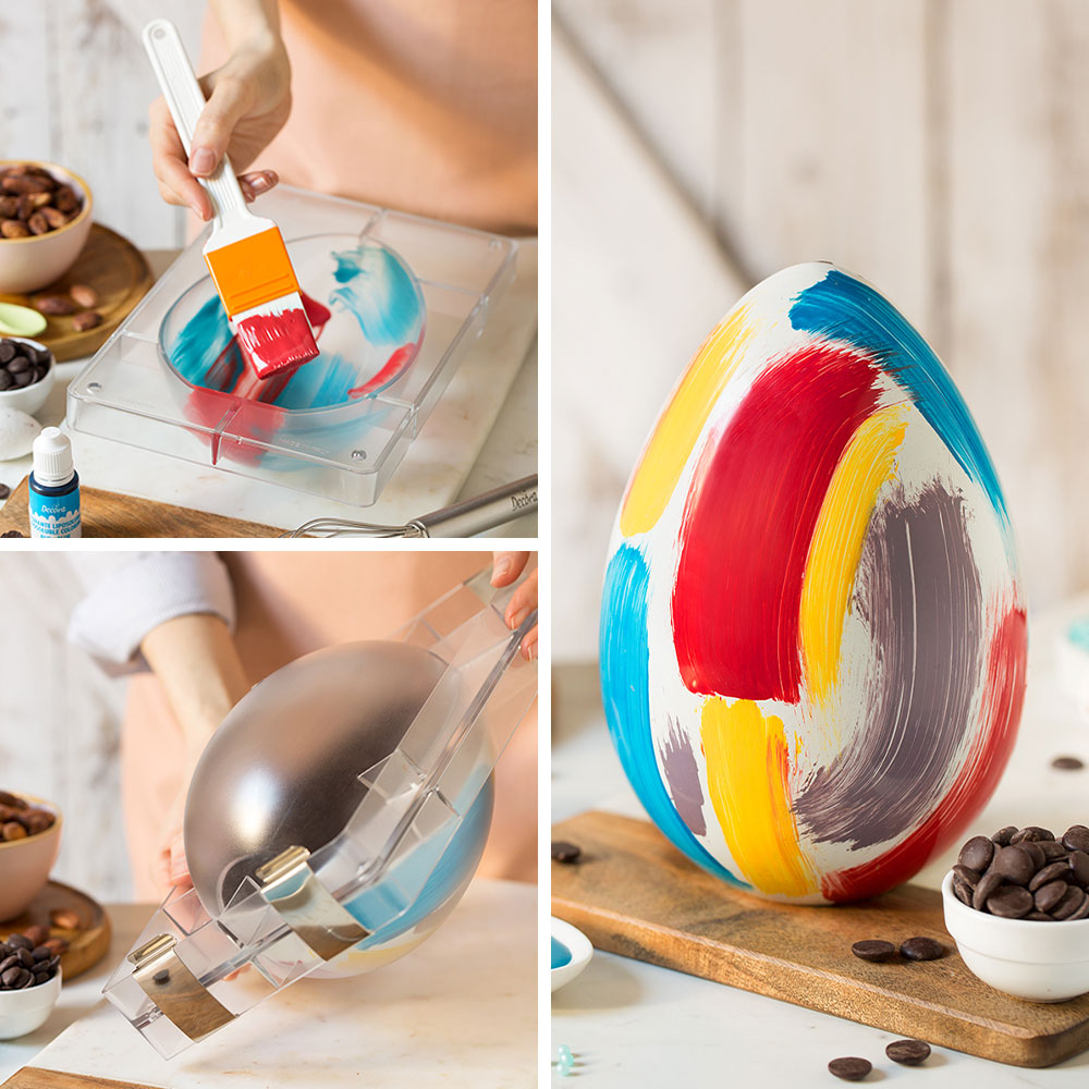 Kit consisting of 2 polycarbonate egg molds and 4 chromed springs, perfect for making chocolate eggs in a single step. Practical step-by-step brochure contained inside. If you want to get colored eggs, brush the mold with fat-soluble dye or add it to melted chocolate. You can also paint floral motifs or abstract decorations. Have fun customizing the eggs with croissant decorations in royal icing or using ready-to-use sugar decorations.