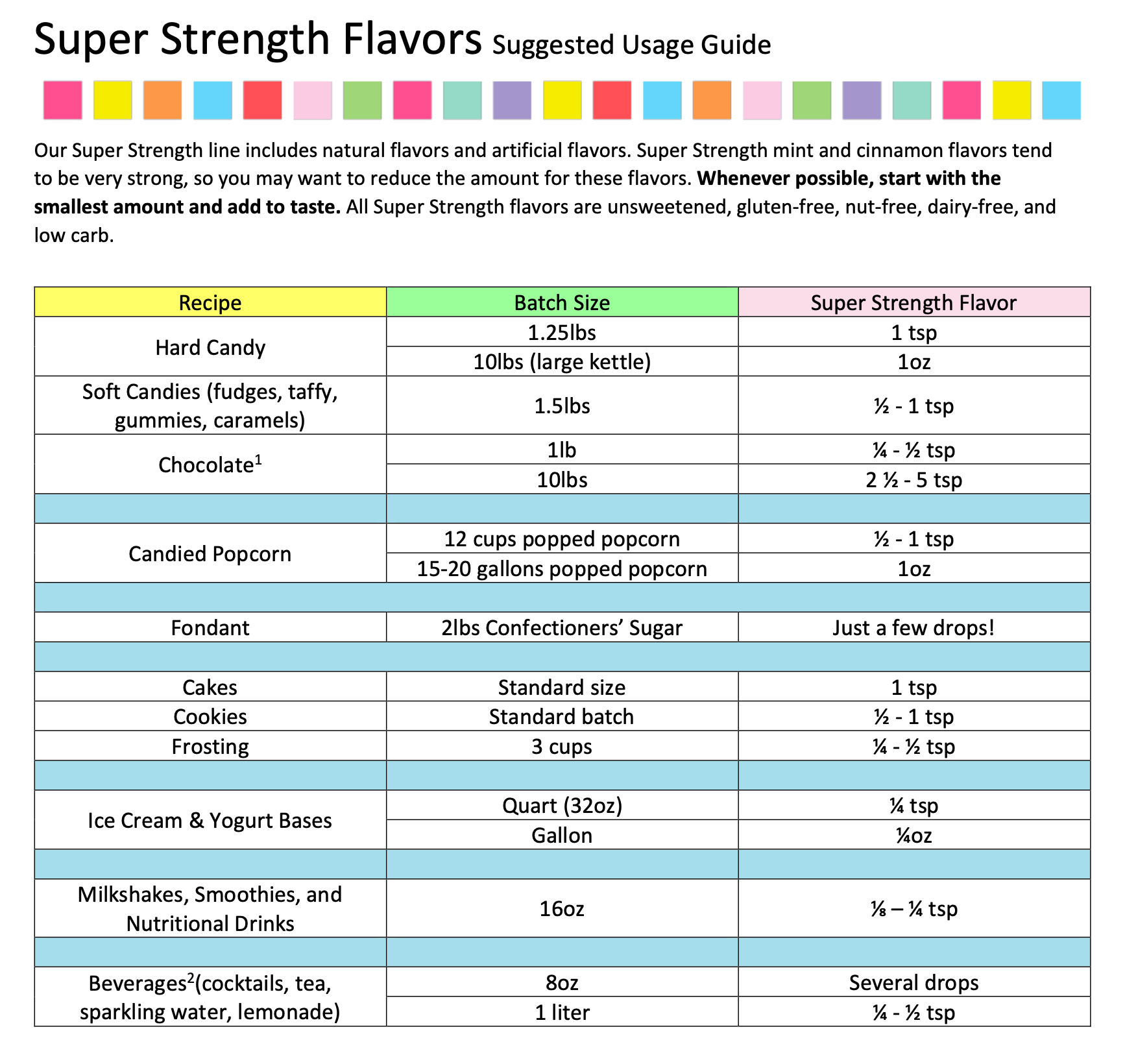Það þarf að nota um helmingi meira af þessum bragðefnum en sterku bragðefnunum frá LorAnn Oils. Nátturulegu bragðefnin eru hins vegar helmingi sterkari en extract bragðefni og því skal nota minna af þessum bragefnum í uppskriftir sem gefa upp extract.