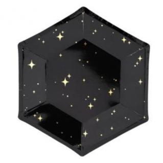 Pappadiskar - Sexhyrndir - Stjörnur - Svartir og gylltir - 20 cm - 6 stk